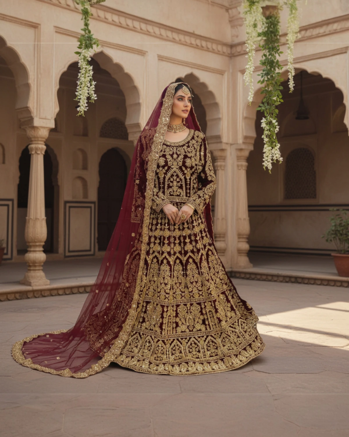 - Color: Deep Maroon with Gold Work