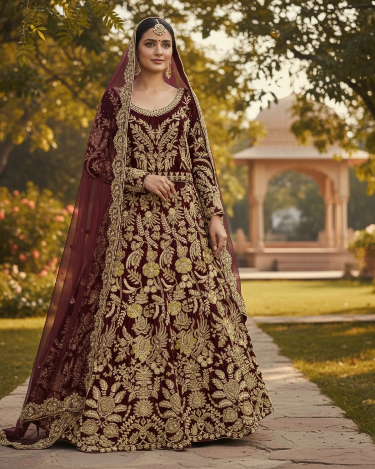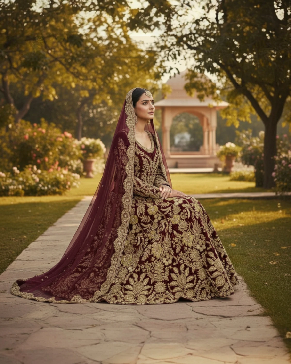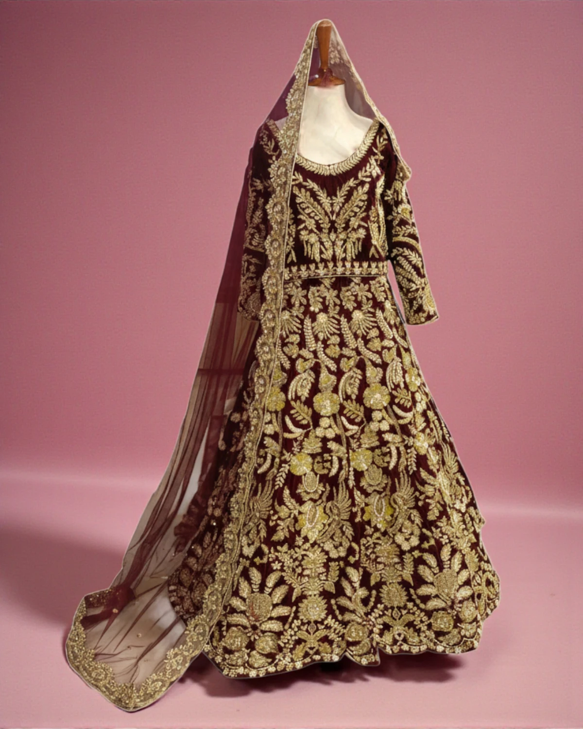 This bridal lehnga is designed for brides who want a deep, luxurious, and traditional bridal look. The outfit features a heavily embroidered choli paired with a flared lehnga, both adorned with dense floral gold embroidery. The velvet base adds depth to the color, while the detailed embroidery and structured flare create a rich and graceful bridal silhouette suitable for grand wedding functions.