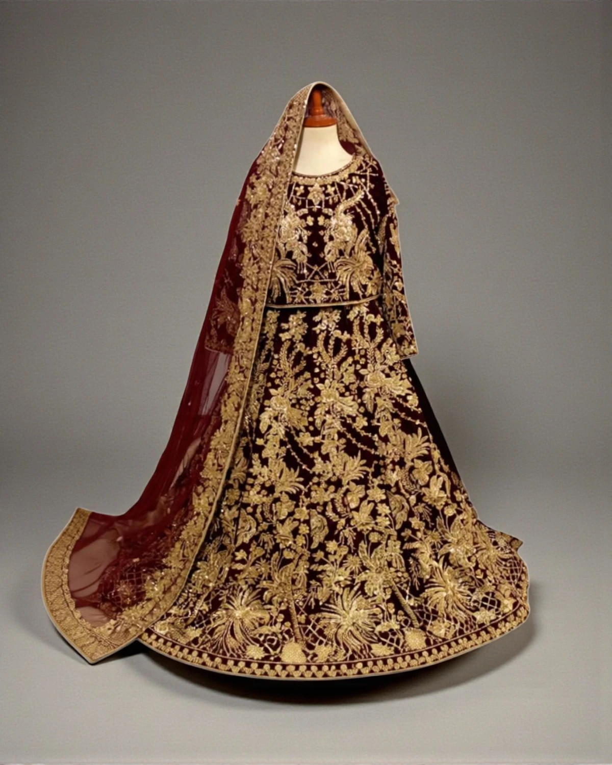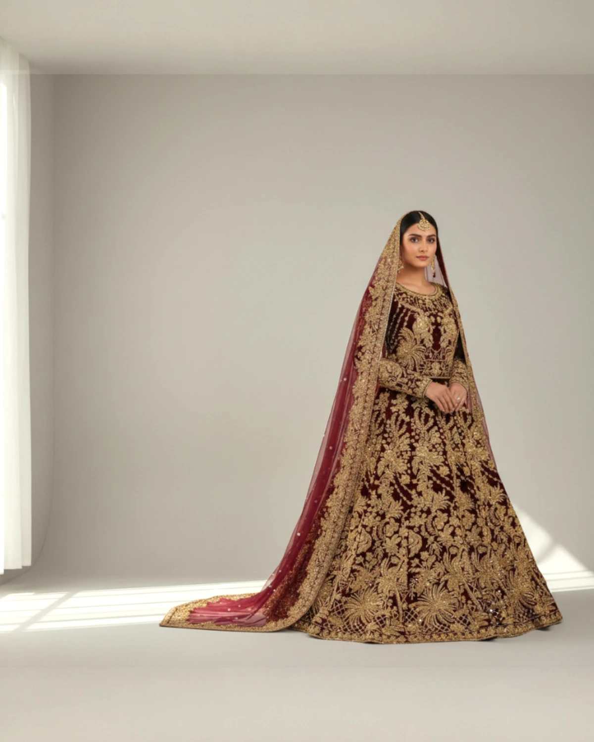 • Color: Deep Maroon with Gold Embroidery
