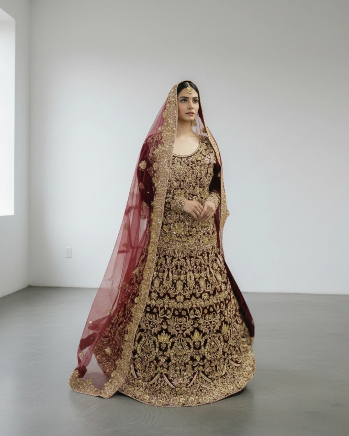 • Color: Deep Maroon with Gold Embroidery