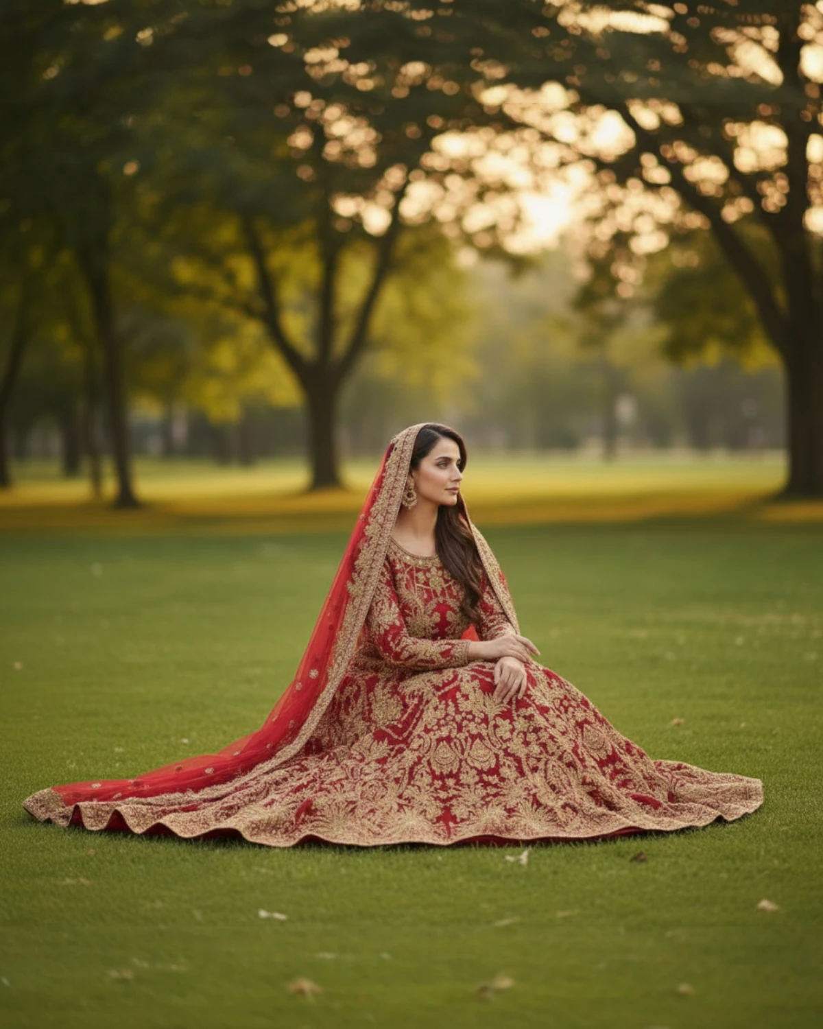 This bridal outfit is designed for brides who want a bright and traditional bridal look with strong visual impact. The ensemble features a heavily embroidered choli paired with a flared lehnga. The gold floral embroidery is spread generously across the choli and lehnga, creating a balanced and elegant appearance. The heavily worked lower border adds weight and grace to the silhouette, making it suitable for grand wedding occasions.