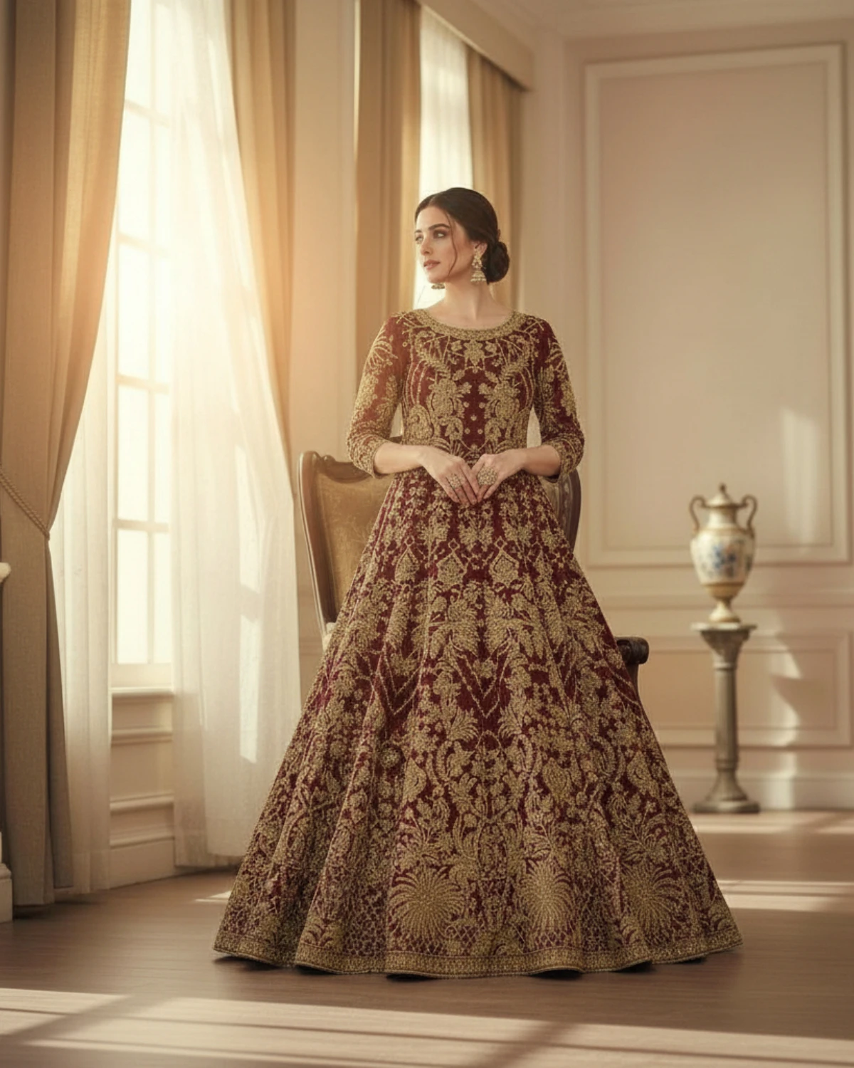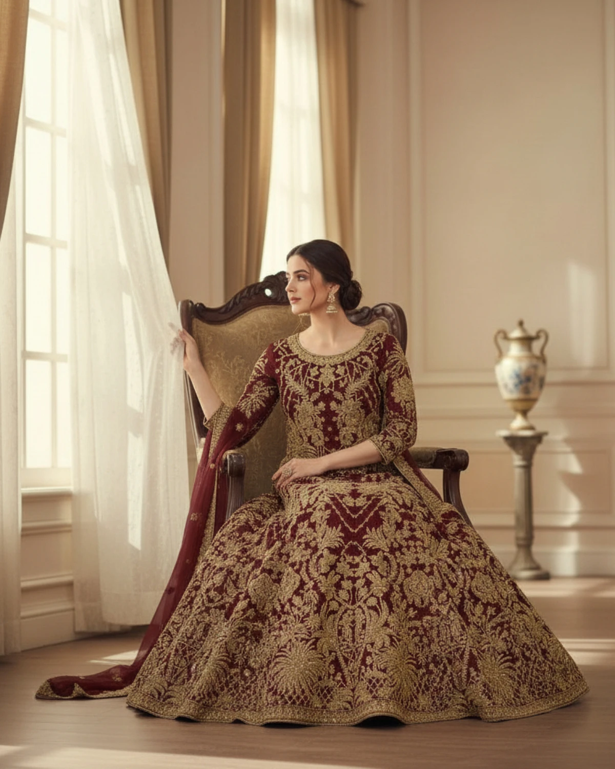 This bridal outfit is designed for brides who prefer a graceful and classic bridal look. The ensemble features a embroidered choli paired with a flared lehnga. The gold floral embroidery is spread evenly across the shirt and lehnga, creating a soft yet richly detailed appearance. The balanced embroidery and finished border give the outfit an elegant flow, making it suitable for formal wedding functions.
