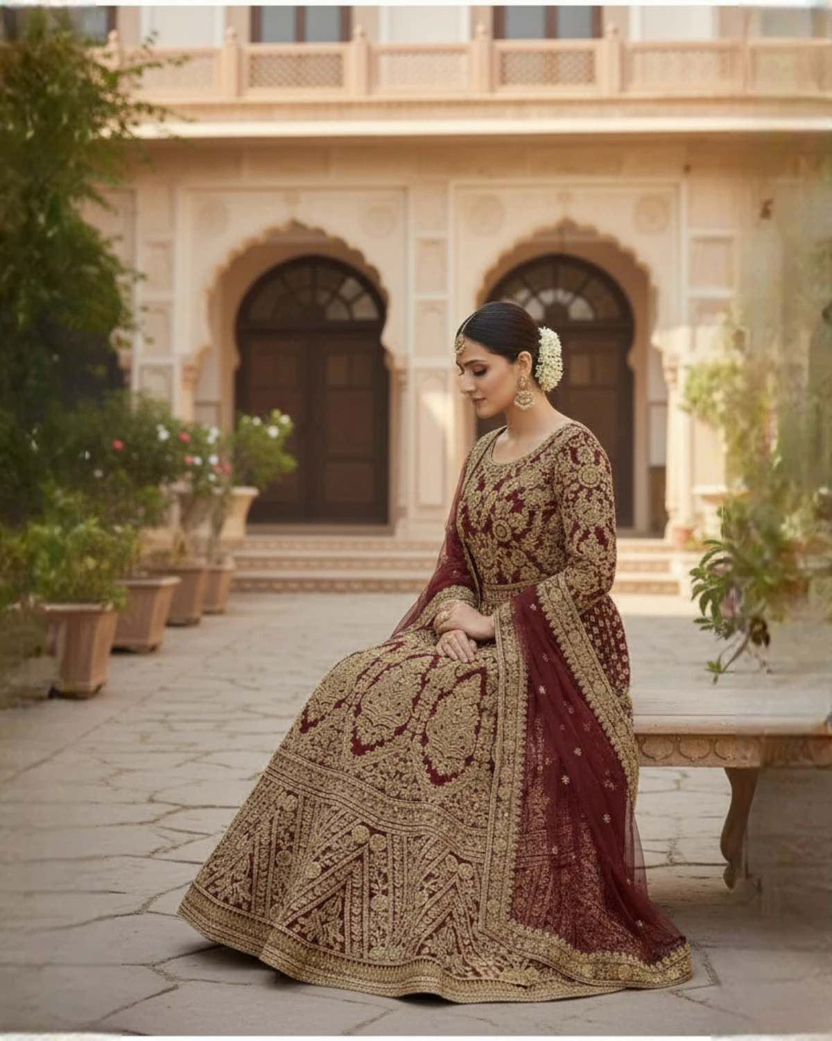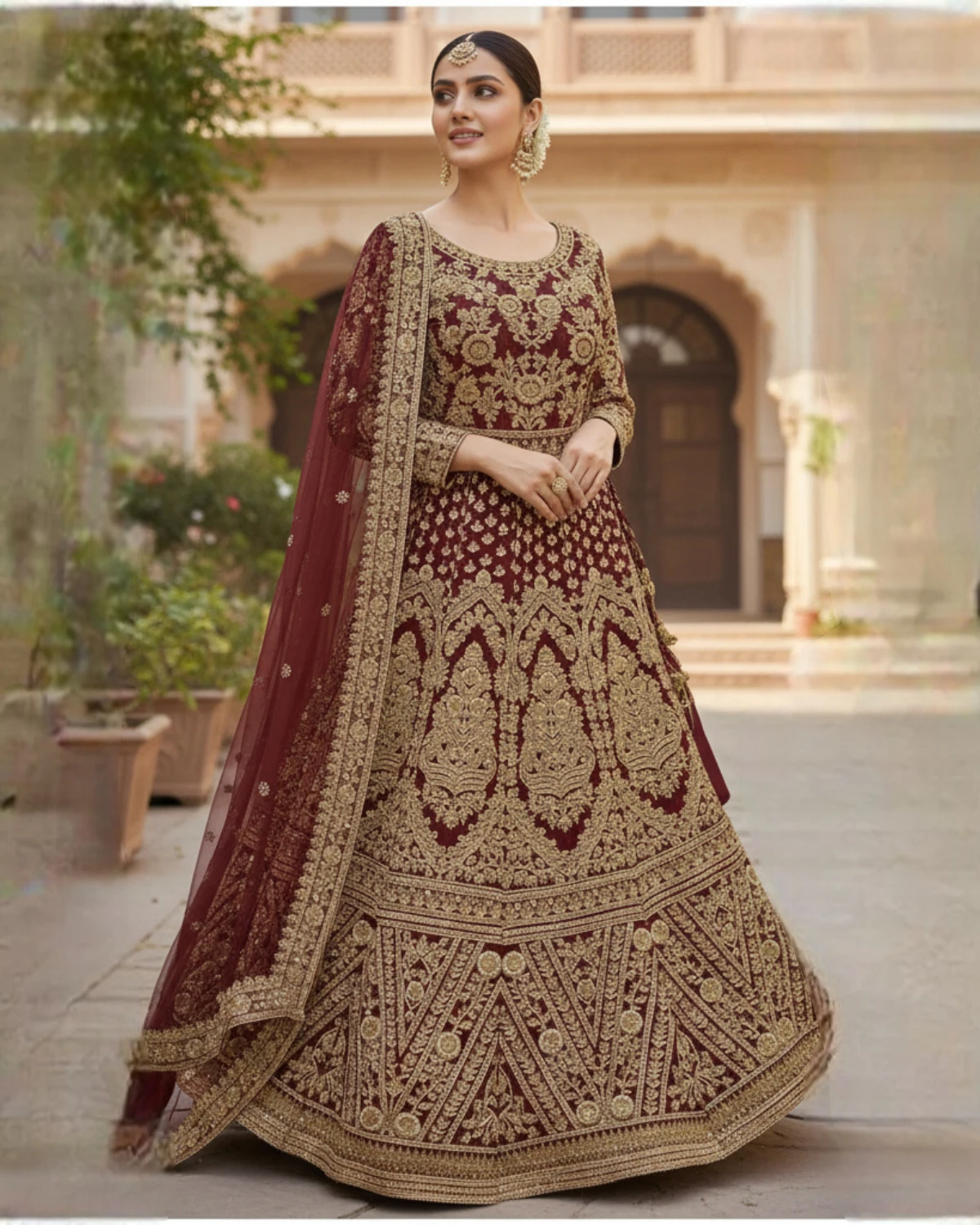 - Color: Deep Maroon with Gold Embroidery