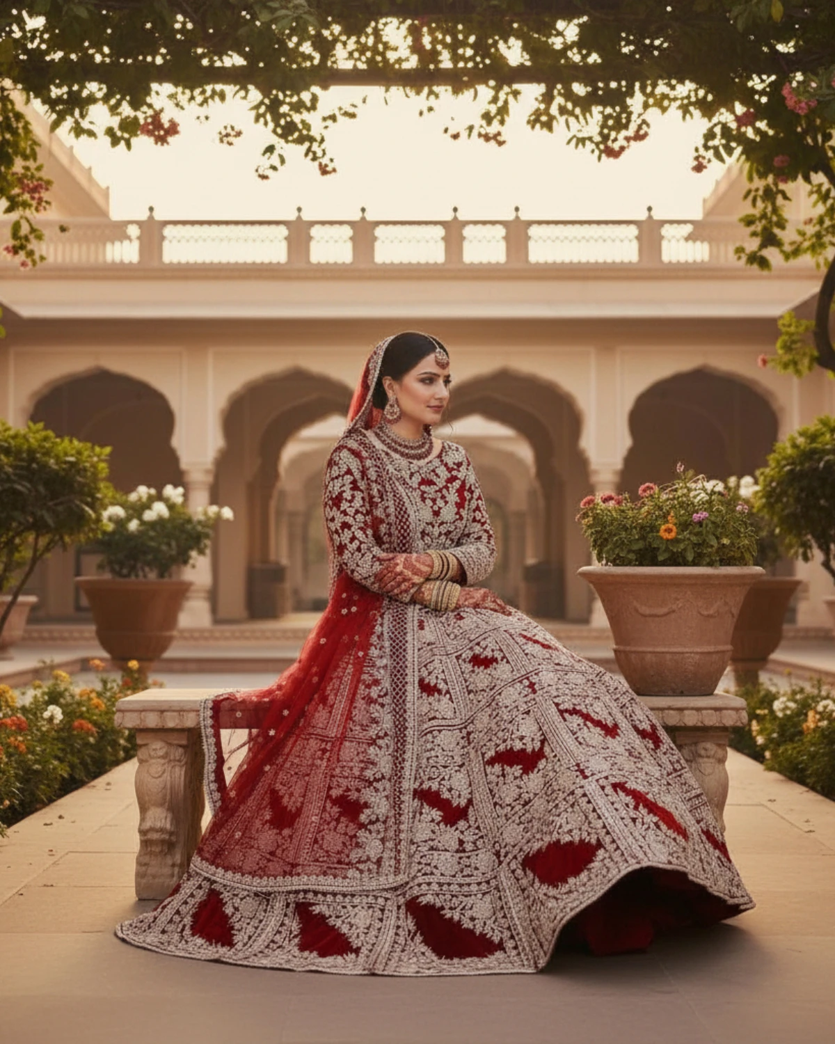This bridal outfit is designed for brides who want a traditional and graceful bridal appearance rooted in classic Mughal aesthetics. The ensemble features a embroidered choli paired with a flared lehnga. The embroidery is arranged in structured panel patterns across the lehnga, giving the outfit a regal and balanced look. The detailed borders and evenly spread work create a strong bridal silhouette, making it suitable for grand wedding occasions.
