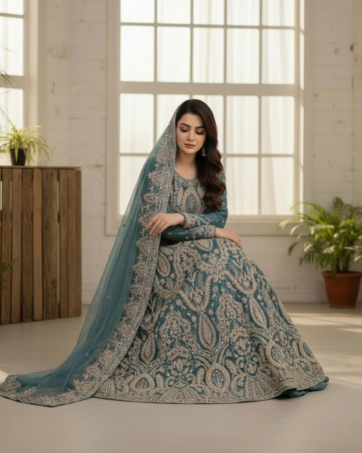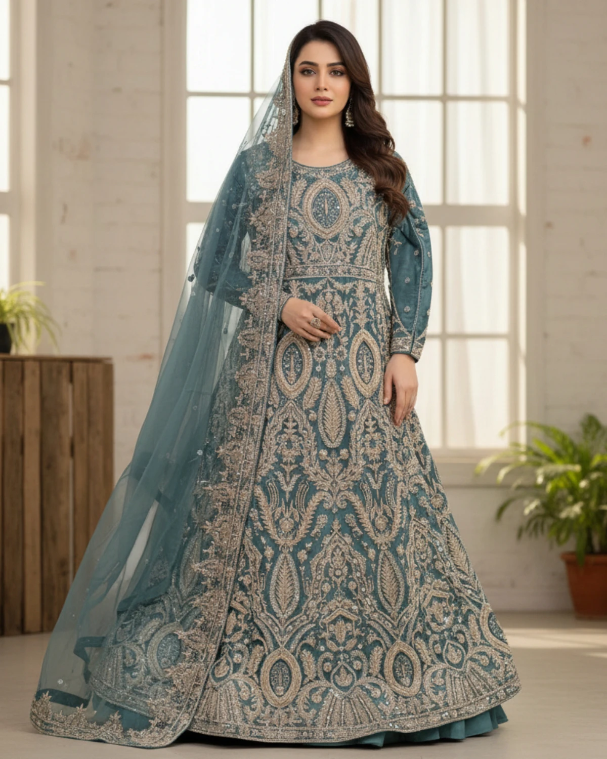 This outfit is a full-length bridal maxi (frock style) featuring a structured bodice and a wide, flowing flare. The embroidery is heavily concentrated on the bodice and hem, with evenly spaced motifs across the flare, giving the maxi a regal and well-balanced finish.