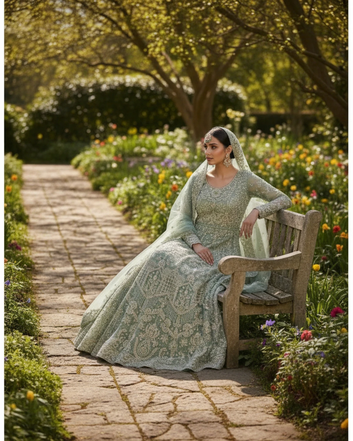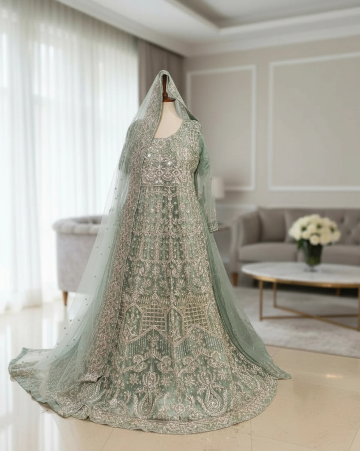 This outfit is a full-length bridal maxi (frock style) featuring a structured bodice and a wide, flowing flare. The embroidery is heavily concentrated on the bodice and hem, with evenly spaced motifs across the flare, giving the maxi a regal and well-balanced finish.