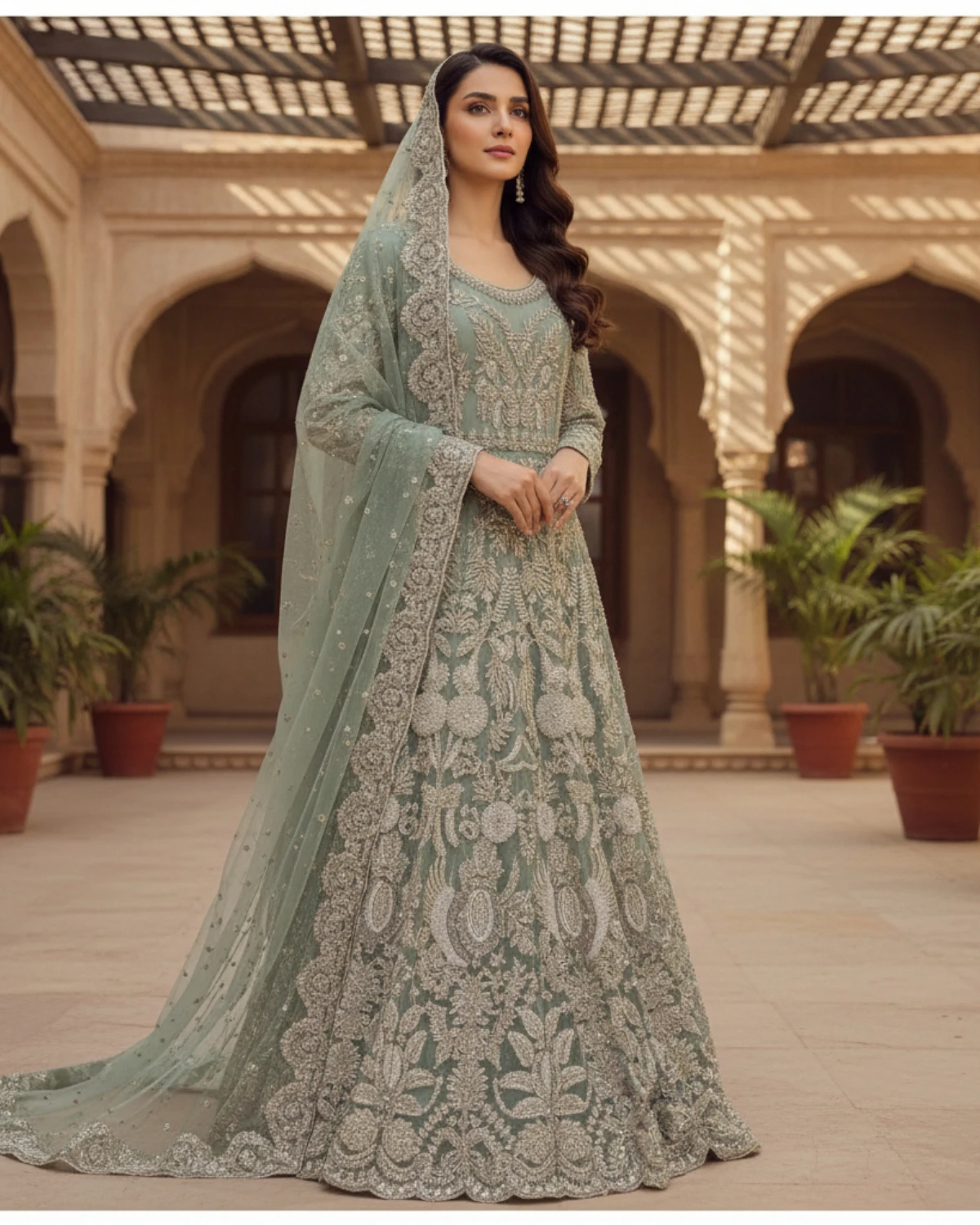 • Embroidery: Silver zari, sequins, and fine thread work