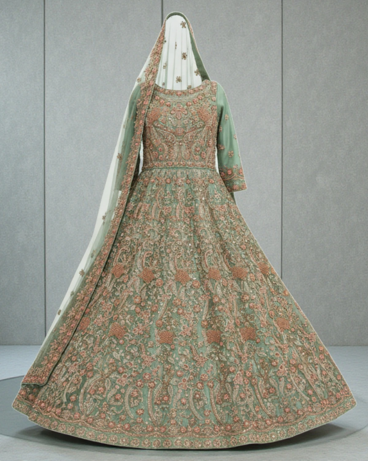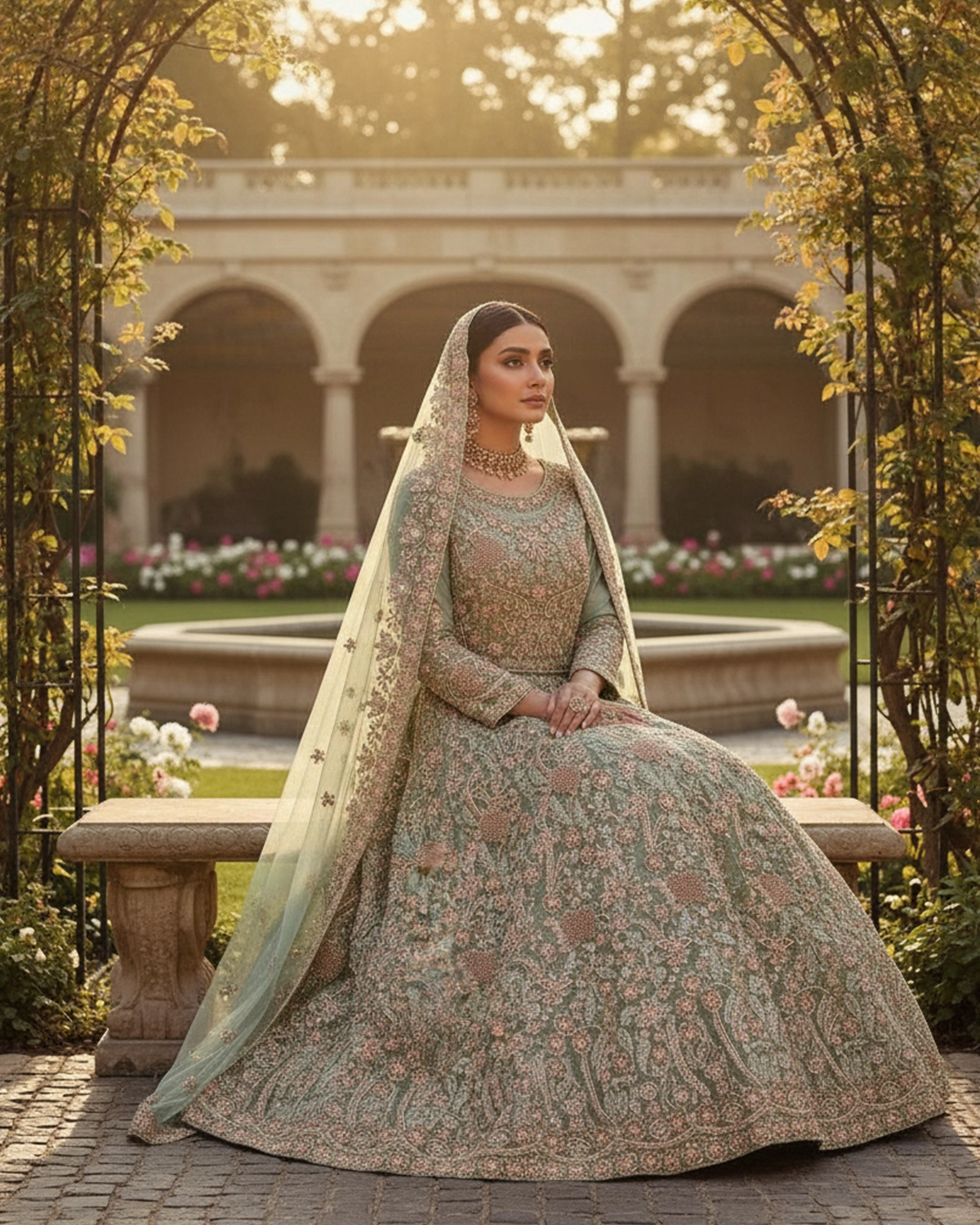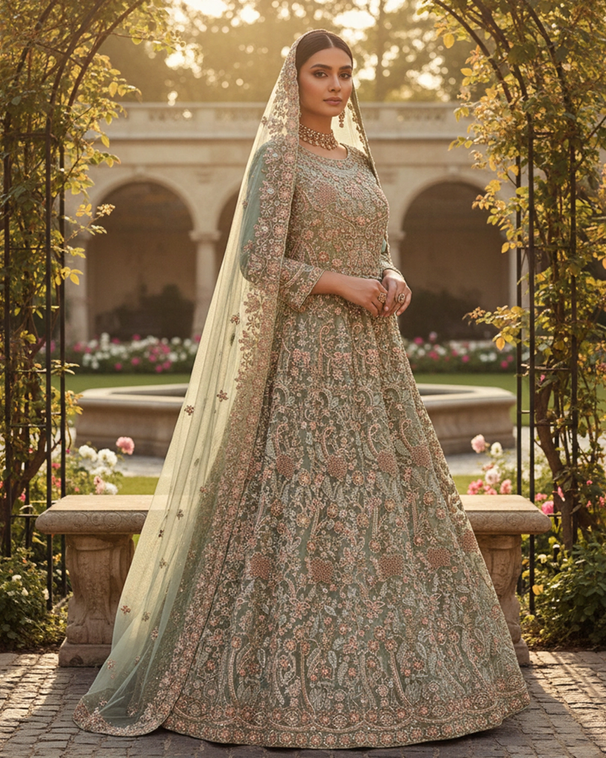 This outfit is a floor-length bridal maxi (frock style) with a graceful flare and structured bodice. The embroidery is evenly distributed from top to bottom, giving the maxi a soft flow while maintaining a rich bridal appearance. The overall look is refined, feminine, and ideal for daytime or evening wedding functions where elegance matters more than heavy volume.