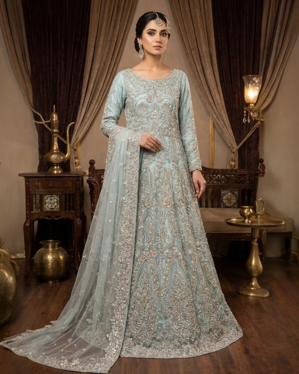 Teal Luxury Formal Maxi With Heavy Silver Embroidery